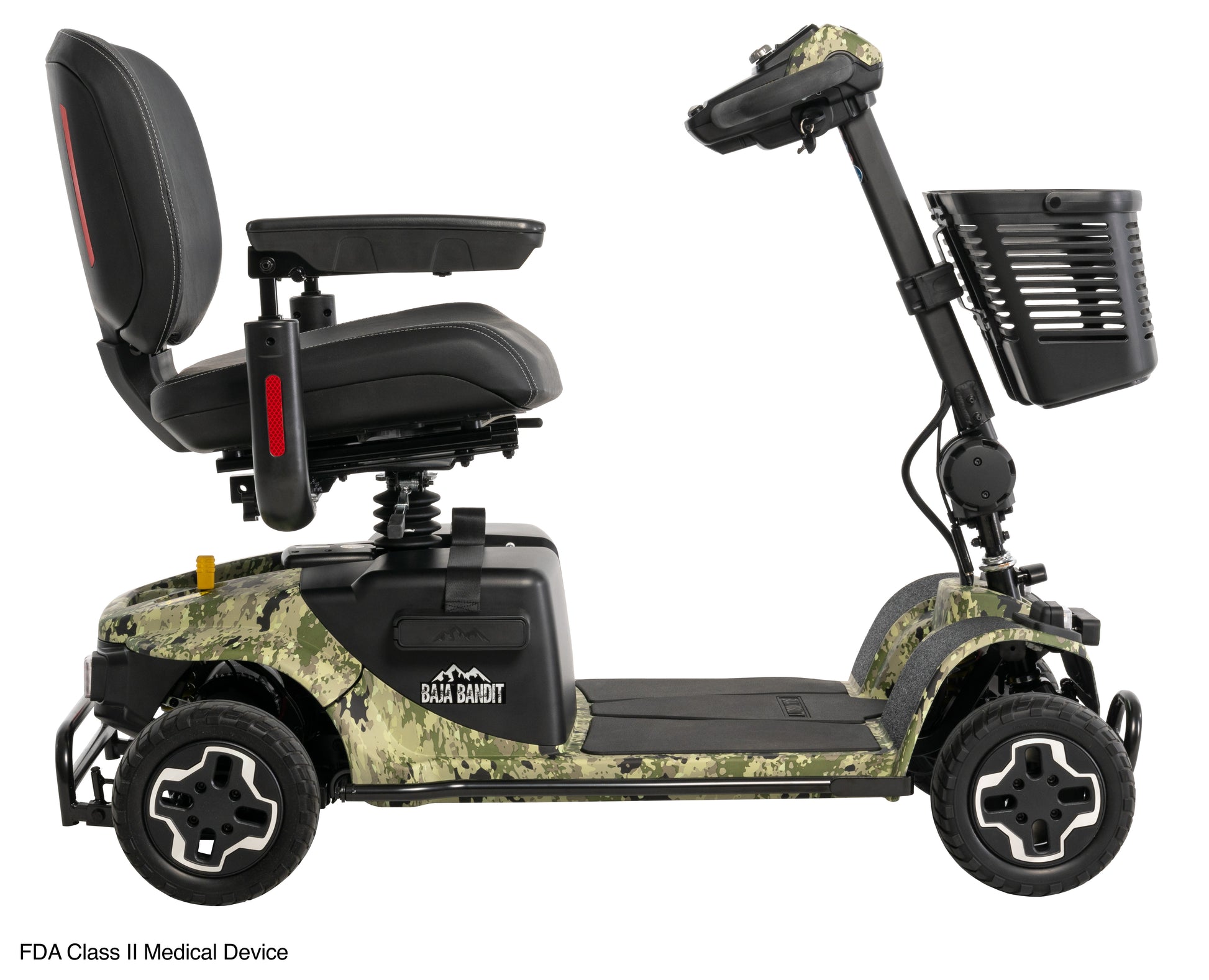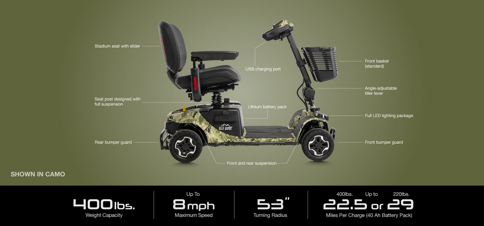 Venture with confidence knowing you’re equipped with the perfect blend of power and agility for all your journeys. An impressive ground clearance of 4.5” will get you through those rough spots with ease, and you’ll be flying on flatter stretches with a top speed of 8 mph. With a 400-pound weight capacity and an upgradable dual lithium-ion battery configuration that delivers up to a 29-mile range, the Bandit is built to defy the elements – and keep you moving all day.
