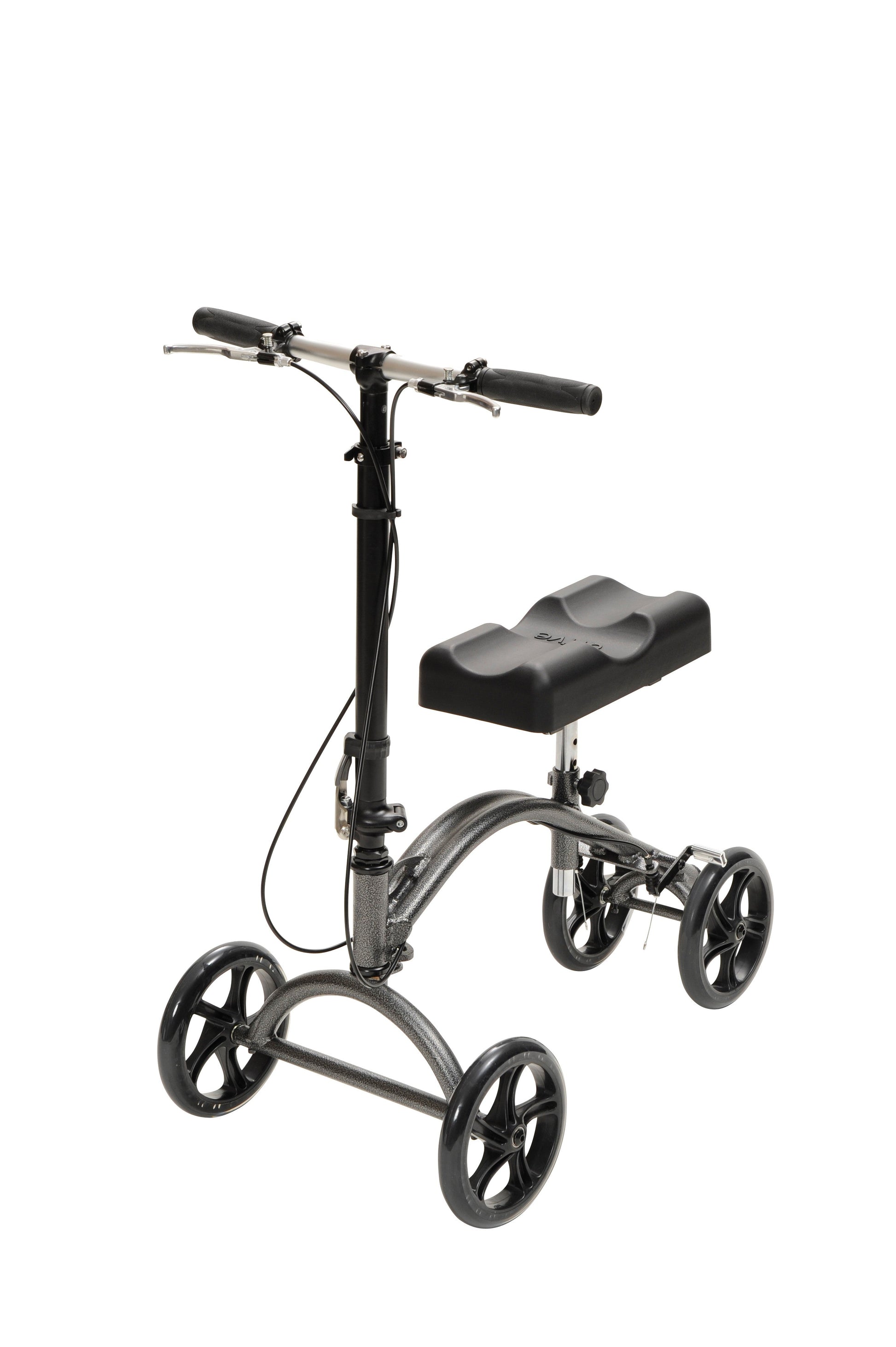 The DV8 Steerable knee walker by Drive Medical provides a comfortable pain free alternative to crutches and is ideal for individuals who are recovering from foot surgery, breaks, sprains, amputations and ulcers of the foot. This innovative and stylish crutch substitute can be easily adjusted without tools to meet your needs allowing for increased maneuverability. The DV8 is equipped with large 8" casters and dual frame design providing maximum control when used indoors or outdoors. This knee walker comes standard with tool free height adjustable dual hand brakes ensuring optimal safety and security when in use. The extra thick leg pad can be height adjusted and is channeled to provide increased stability allowing for a pain free comfortable experience. One of the greatest features of the DV8 knee walker is how easily the unit folds without tools making travel, storage or just getting around easy.